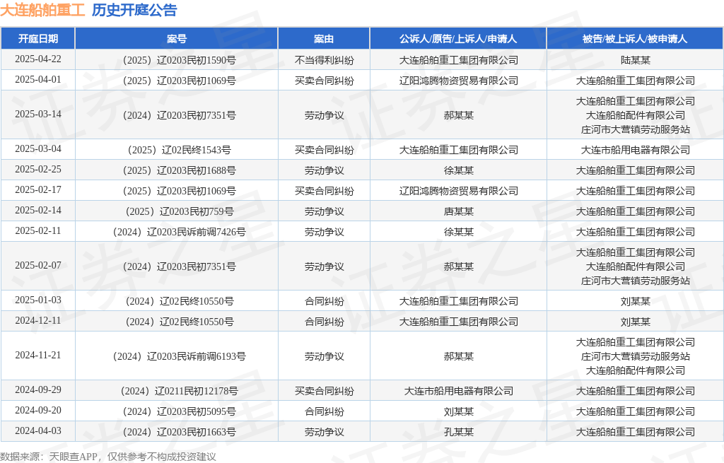 根据统计◈ღ✿,近一年内以大连船舶重工集团有限公司为当事人的历史开庭公告有15则◈ღ✿,其中案由为“劳动争议”的公告以7则居首◈ღ✿,其次为“买卖合同纠纷”有4则◈ღ✿,“合同纠纷”有3则◈ღ✿。历史开庭公告如下◈ღ✿: