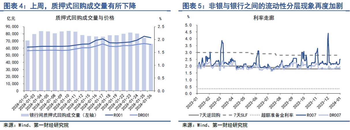 临近春节假期◈★✿✿,银行间市场流动性偏向紧张◈★✿✿。上周◈★✿✿,银行间质押式回购成交量下滑◈★✿✿,由前一周的日均7.71万亿元下降至7.64万亿元◈★✿✿。主要货币市场利率上行◈★✿✿,在隔夜回购利率中◈★✿✿,R001与DR001分别较前一周上升8bp和5.7bp至1.99%和1.8%◈★✿✿。非银与银行之间的流动性分层现象再度加剧◈★✿✿,截至1月26日◈★✿✿,R007与DR007之间的差值上升至55.85bp◈★✿✿。1月24日◈★✿✿,央行行长潘功胜在国新办举行的新闻发布会上宣布◈★✿✿,央行将于2月5日下调存款准备金率0.5个百分点◈★✿✿,向市场提供长期流动性1万亿元◈★✿✿,并表示“要把维护价格稳定◈★✿✿,推动价格的温和回升◈★✿✿,作为把握货币政策的重要考量”◈★✿✿。在去年12月召开的中央经济工作会议上◈★✿✿,针对货币政策的表述由此前的“保持广义货币供应量和社会融资规模增速同名义经济增速基本匹配”改变为“社会融资规模◈★✿✿、货币供应量同经济增长和价格水平预期目标相匹配”◈★✿✿,其中的主要差别在于突出了价格水平预期目标这一重点◈★✿✿。央行今年明确表示将抬升通胀作为货币政策的重要考量◈★✿✿,而年初的这一降准措施就是抬升通胀的有力选项◈★✿✿。