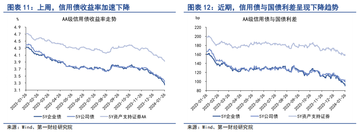 上周◈★✿✿,信用债收益率普遍下降◈★✿✿。在AAA级债券中◈★✿✿,5年期企业债◈★✿✿、公司债以及资产支持证券收益率分别下降3.8bp◈★✿✿、5.38bp和4.21bp◈★✿✿。在AA级债券中一本大道中文无吗◈★✿✿,5年期企业债◈★✿✿、公司债和资产支持证券收益率分别下降10.6bp◈★✿✿、6.9bp和7.64bp◈★✿✿。